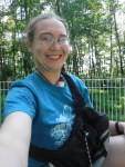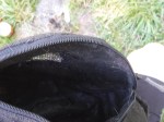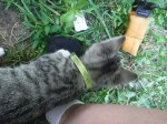 Anyway, today I took the dogs for a quick walk after I got home from work. And I took Jezza!! Wooo-hoo! He wore a cat collar (break-away in case he got loose and then got stuck, he wouldn’t strangle or hang so easily from the collar), and also a kitten harness, which on it’s smallest setting actually is barely small enough for him. And that was connected to a cord about 8 feet long, and that was connected to (but not shown in the pictures because I forgot to take it out of the little section of the pouch) to a small zip-style extenda leash thing. And there’s the black pouch thing, which was not designed to hold kittens (or even 1 kitten), it’s been hanging around the house being used for various things on rare occasion, and it originally came with Ryan’s white water kayaking helmet. It has a strap which fits nicely over my neck and one shoulder, and it has a zipper opening to the main large portion of the pouch, where the kitten goes in (bottom first) and his cute little head sticks out through the partially closed zipper area.