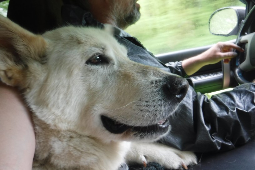 Ralf and Kyle fit in the back seat of the truck ok, but they both enjoy sticking their heads up between the seats when they get the chance. And they both specialize in their own “this is the life” smug/happy face. Here are a few of Ralf’s demonstrations of the face.