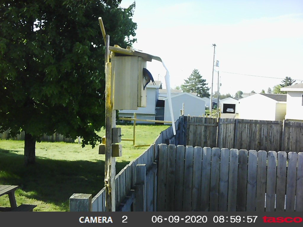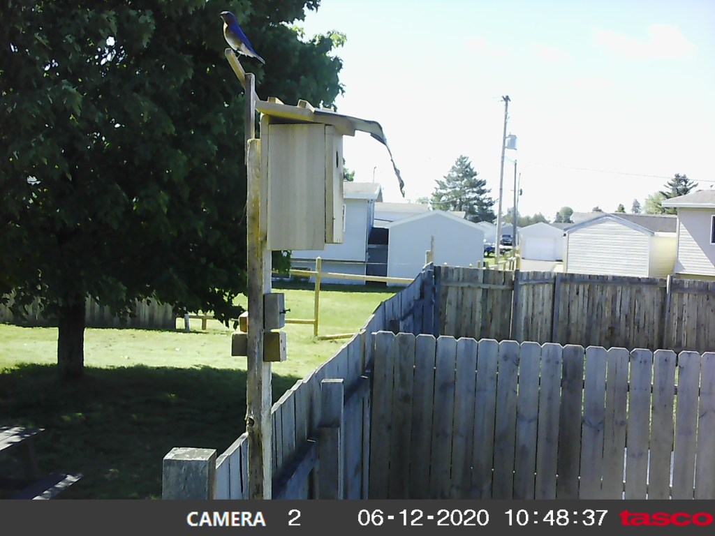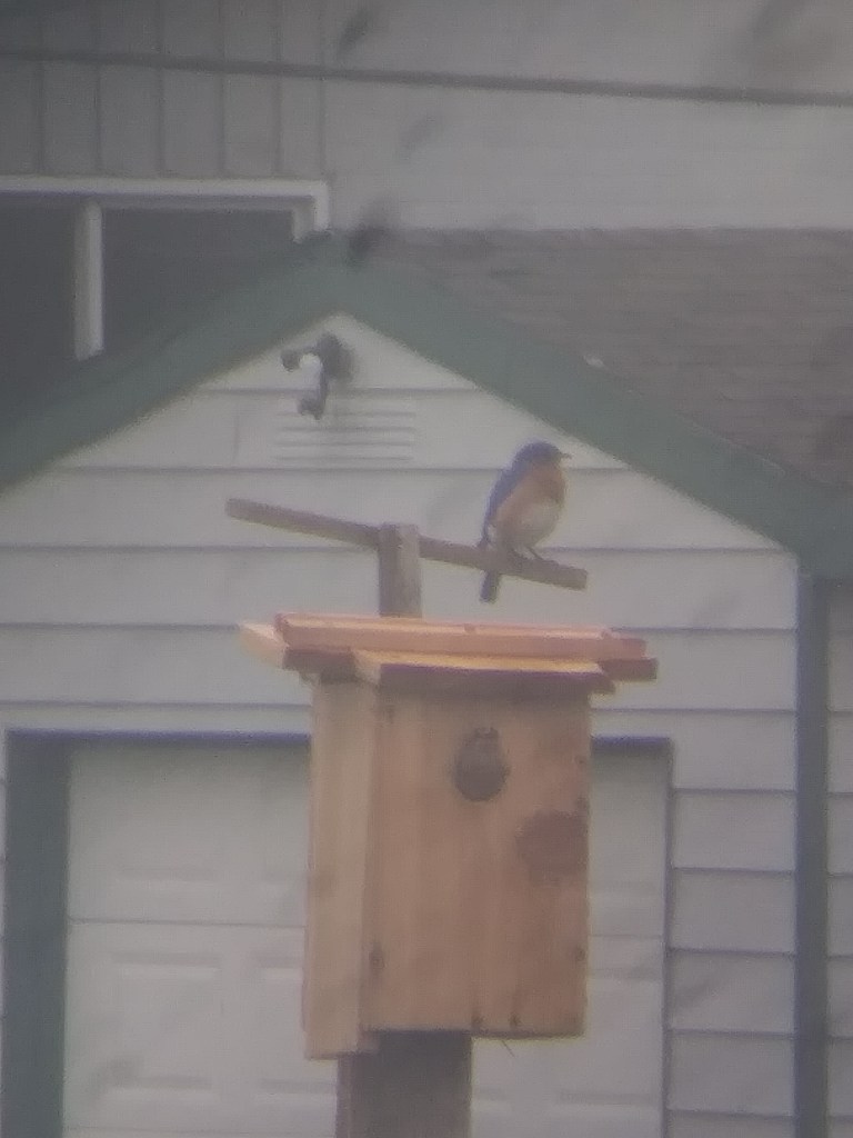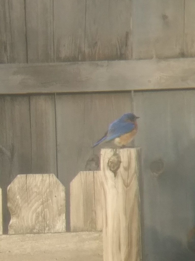 And after a week or so of nothing, I was somewhere else in the neighborhood and saw an Eastern Bluebird and was like “HMMM if I can’t get swallows, maybe, maybe a bluebird? Or I can give the nest box spares to someone near here, for this bird?” And then a day later, I saw a bluebird on one of the fences in the backyard area, and was super excited…