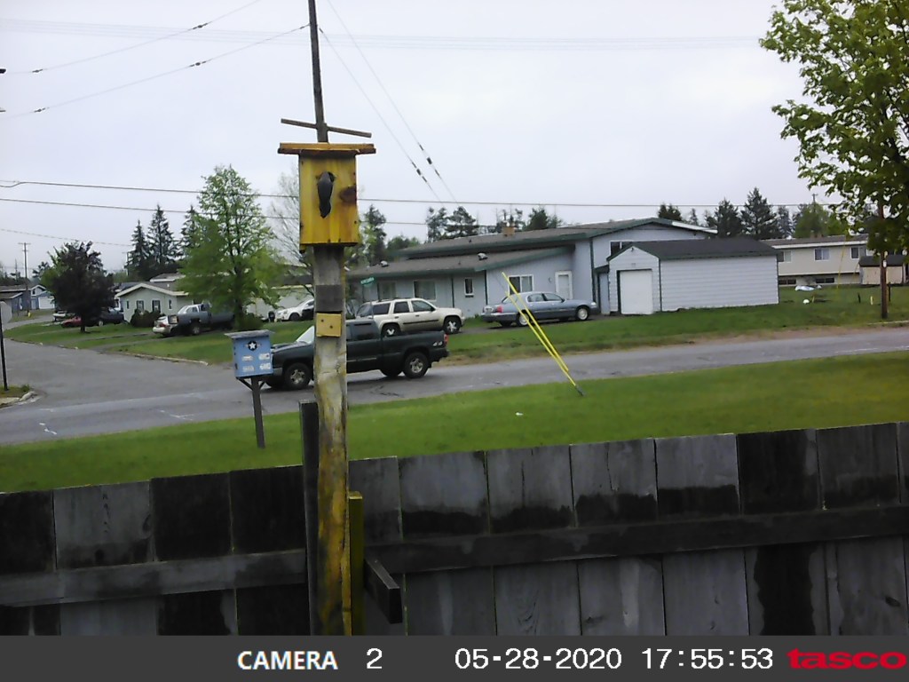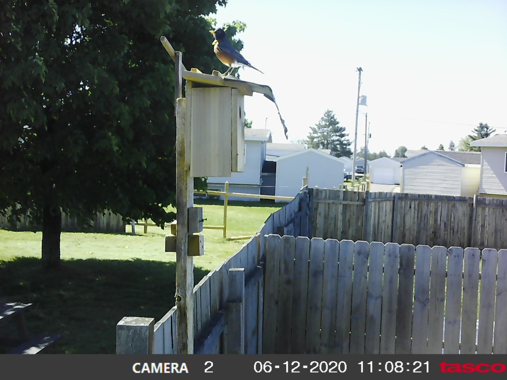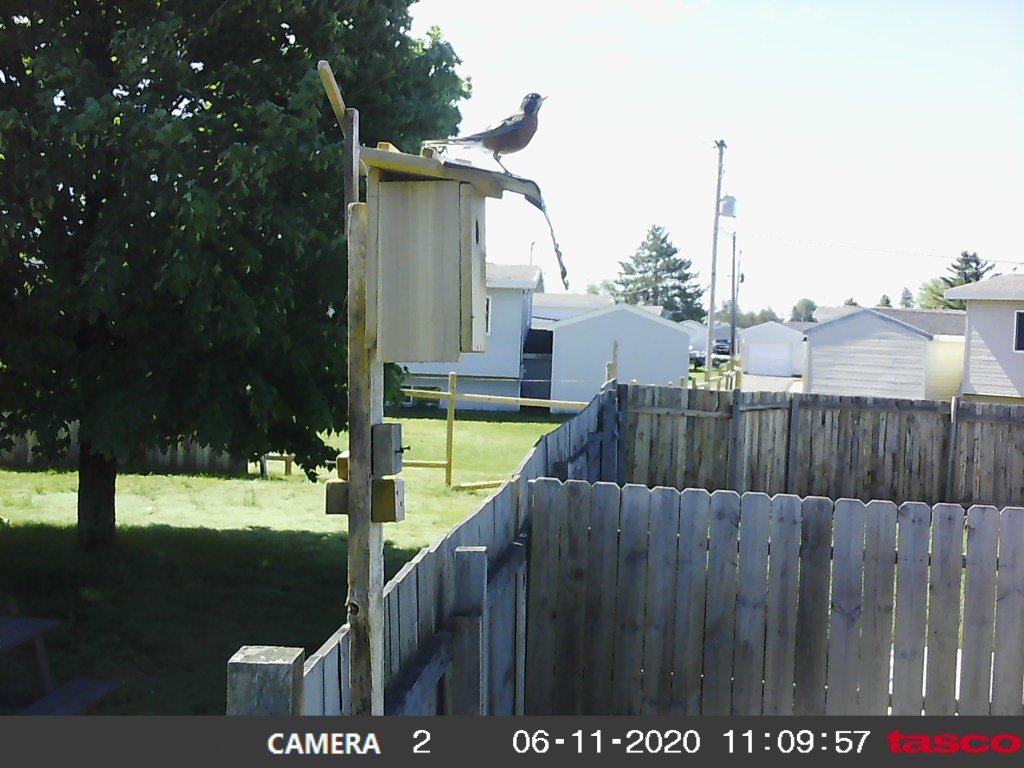 This is the last big chunk of pictures. Some of the early one are the male and female, all sorts of sad and confused on top of the new wren guard… and then I go and switch guards and move the trail camera so it will see from the side of the box. There are two pictures I kept to show how widely flexible the metal flap turned out to be, touching the box at the base from one wind gust and almost a foot from the box at other times from the wind gusts. I also get pictures of other birds, sometimes sparrows or grackles or red-winged blackbirds, but usually, it’s robins…