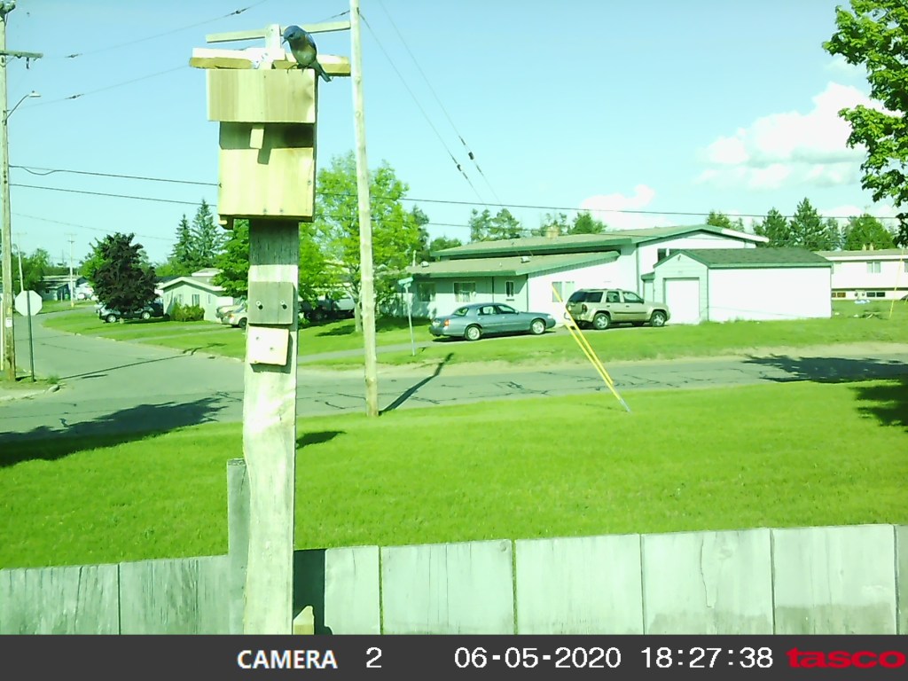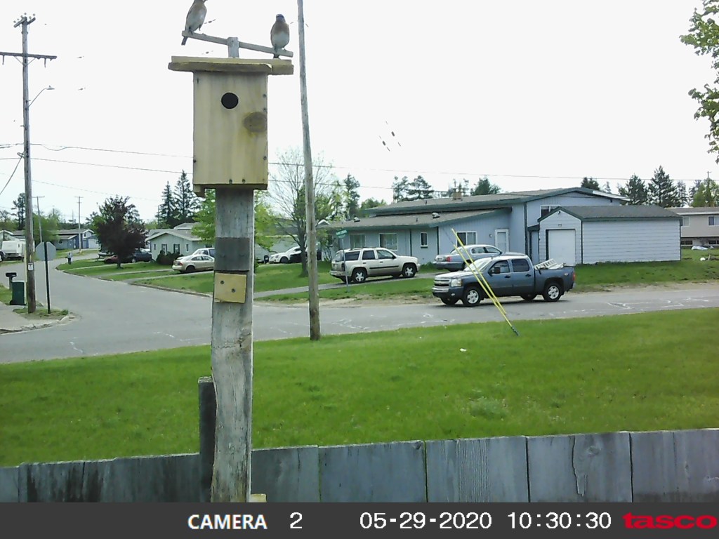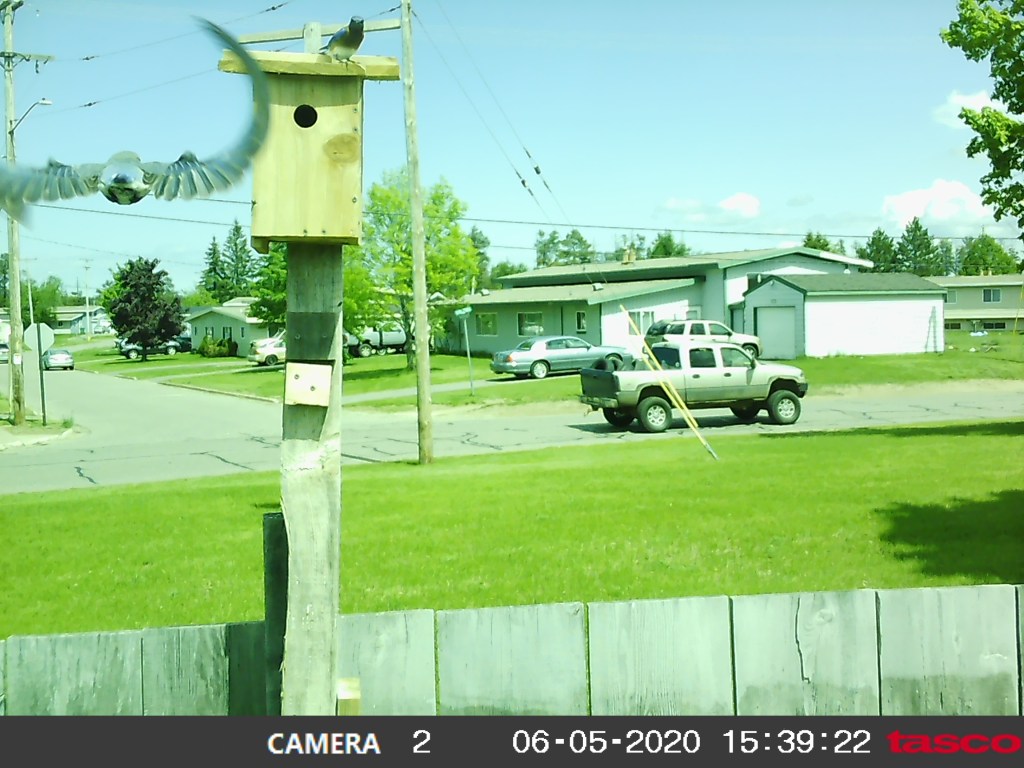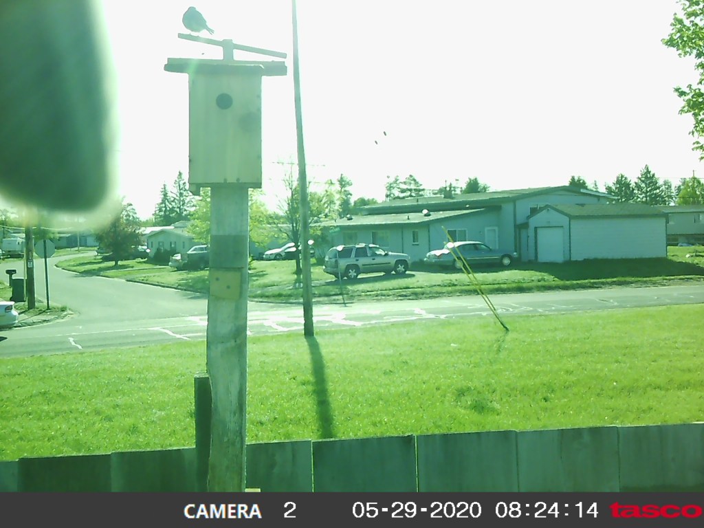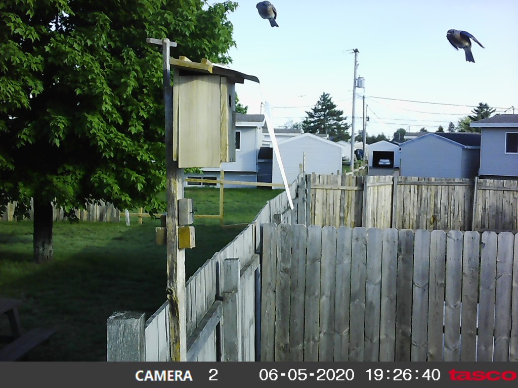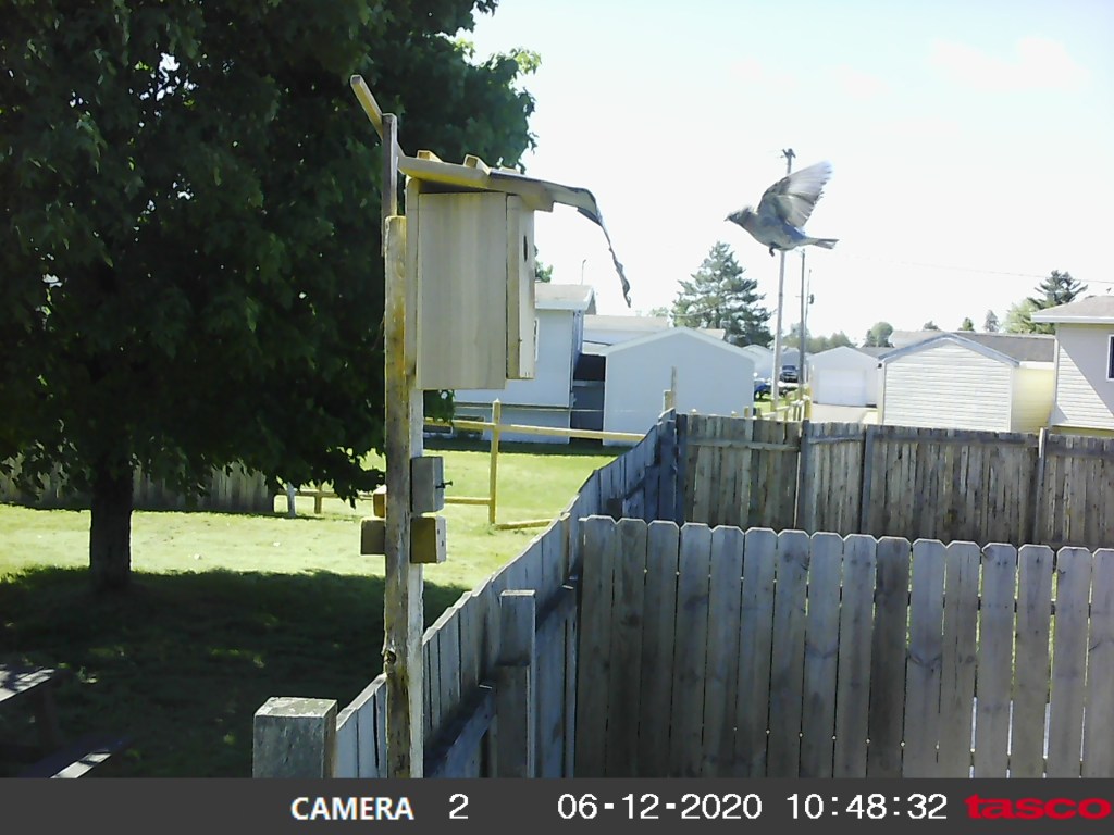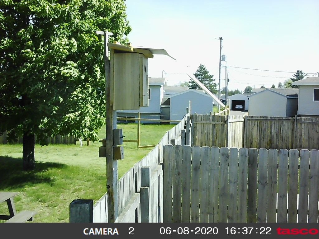 You can also see the set-up I used to hold the trail camera in place, it’s on a spare 2×4 lashed to a curb-alert free hanging swing frame that I will fix later… or not, I like having the hanging plants on it (not in picture). I’ll put the trail camera pictures in at the bottom. Obviously, there is a fourth egg, so mom is able to get in and out. Also, I often hear a sort of soft brushing/scraping noise and flutter when I go to do the check, or sometimes if I go to mess with my plants in the back end of the yard. It’s one of the birds, bailing out of the nest box so a predator doesn’t trap them in the box. Mom zipped out when I went to take the above pictures and then she gave me the evil eye for a while from the fence before flying off to a more covered location.