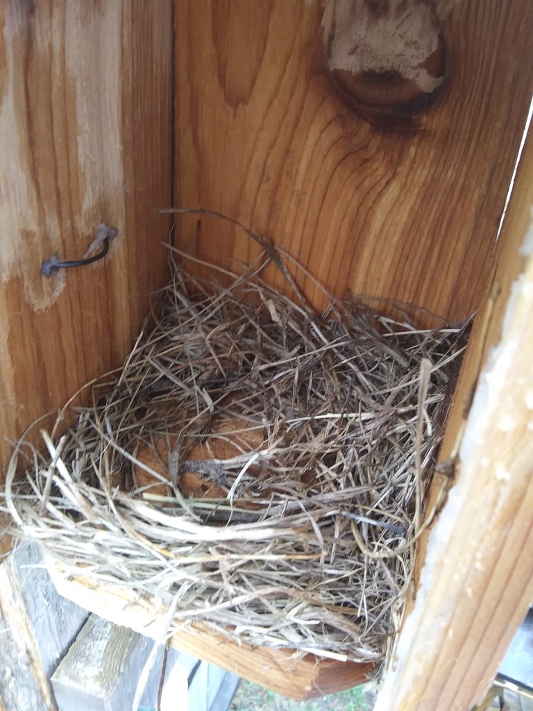 After removing the first two starts made by the wren, there was a while of inactivity again. The sticks may have not even been actual attempts at building a nest to use, it could have been just to crowd out any other birds in the area. They also may have been an actual nest that wasn’t built far enough for him to show off to a female, who then may or may not have been impressed enough to use them. It didn’t have a lined nest cup, which means it was legit to remove the sticks at this point. I don’t know if he decided to give up on annexing my nestbox, or got busy with nesting for real in a nest box in the neighbors yard, I don’t know. I do hear house wrens quite often (like almost every time I go outside during the day), so they’ve not left the area. I didn’t think to take pictures of the sticks, sorry. Imagine a small pile of 4 inch long twigs thinner than a pencil, almost in a sort of cup/circle shape if you squint, and put in the bottom of the nestbox.