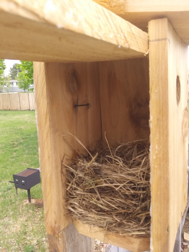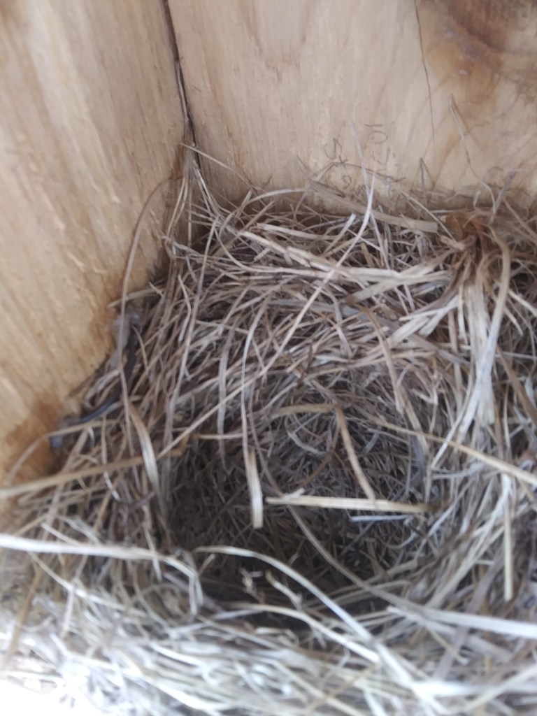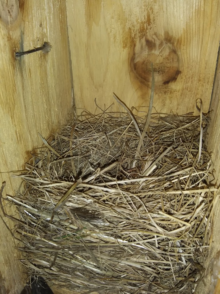 And then in a less than a day, my nest box check revealed a grass cup. Internet searches said that bluebirds use dried grasses, basically only dried grass. Looking good!