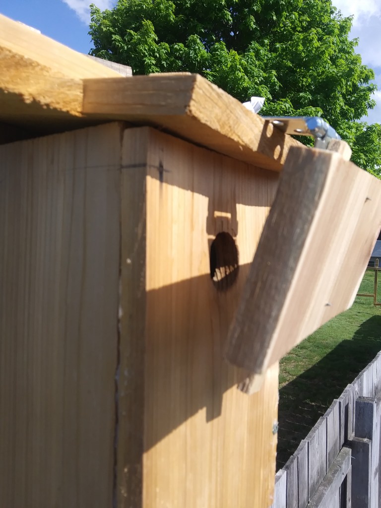 Both of them did. And they didn’t seem to be able to squeeze/fly in to get to the hole. Knowing my design wasn’t perfect, and after watching the male and female on the top of the box, trying to figure out how to get in… and then when the female started to try to pull the twist tie off she looked so distressed and desperate… and I just melted so I did a quick “what other building materials can I use?!?” … and I found a piece of scrap from the roof project. I didn’t take the time to cut it shorter, so I was a bit unhappy with the length, but I wanted to move fast. The birds did figure out how to get past it that evening, as I was able to make the flap hang farther from the house and hole.