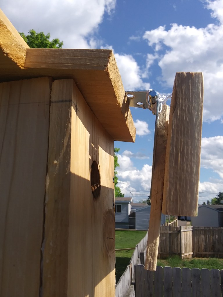 I managed to finally add the wren guard, I got a hinge I thought would work, but it ended up balancing too much toward the nestbox. So I tried to stabilize the hinge with a twist tie, which was a small improvement. I then spent about an hour staring out the windows, to see if the bluebirds would come back and try to go in.