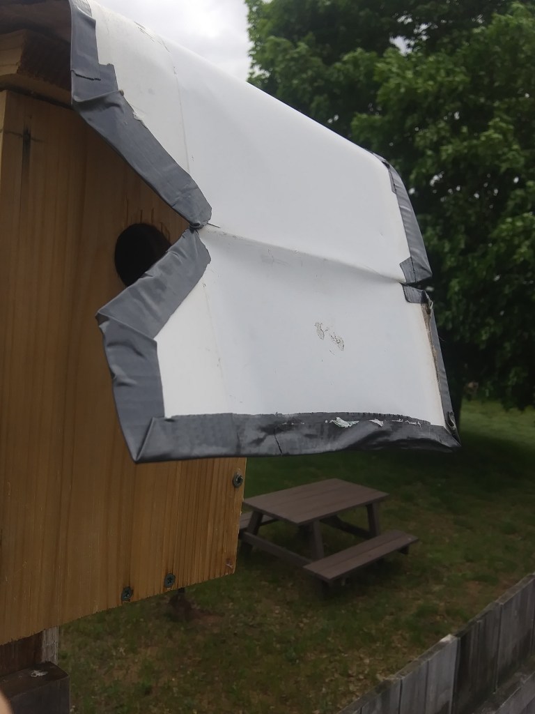 The weather changed a few days later and brought a LOT of strong wind. The wren guard flap was flapping so much I was worried the birds would have trouble getting past it, so I took the chance to go cut it down. I also had wanted to put some sort of edging on the …edge of the metal, in case it was sharp on their feet. So I added a strip of duct tape folded around the edge.