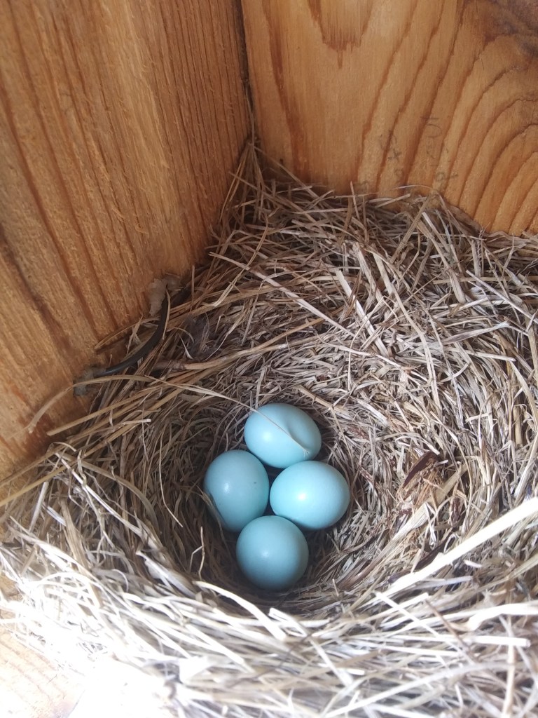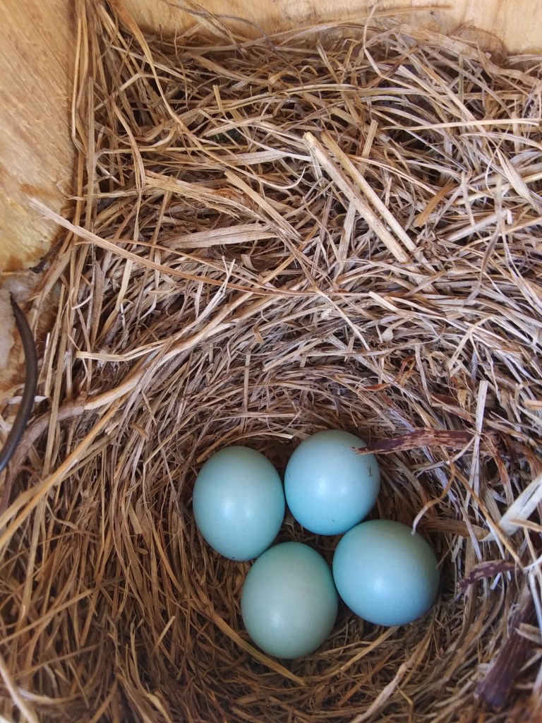 So with four eggs since at the latest, the 8th, I think she probably started sitting on them at some point, as usually an egg is added about every day. I do want to keep a watch every few days, because I want to know when the eggs should hatch, and after that at about day 4-6 I need to take the wren guard down. There would still be danger from the wrens, but the babies will need a lot of food, and that’s a lot of going past the guard, which will stress the parents, so it comes down.
