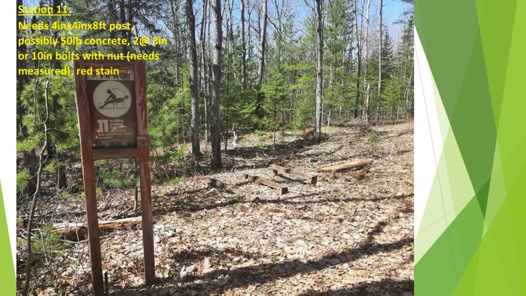 I am currently rebuilding (with help from several others) my community’s fitness trail left over from when K.I. Sawyer was an Air Force based. It has been abandon for the most part since 1996. I am half way complete. I have the entire trail and all its fitness stations cleared of debris and downed trees. Now I’m ready to rebuild each of the stations. I’ve put together a power point presentation and posted the slides below. I am accepting any cash and/or material donations for the trail needs. See end of slides for materials list and costs. You can donate via our GoFundMe page here… https://www.gofundme.com/f/k-i-sawyer-fitness-trail?utm_campaign=p_cf+share-flow-1&utm_medium=copy_link&utm_source=customer