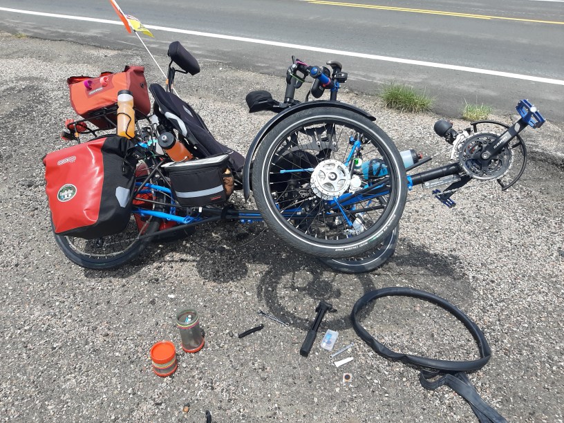 Left out of Pueblo Colorado this morning and barely made the 64 miles to Ordway. Got a few miles out and blew two inner tubes back to back. Couldn’t find the cause so had to stop every 3/4 of a mile to pump up the tire. Made it to this weird town and nothing here. Worked on tire and found two pieces of wire from the trucks who let their bad tires shred off. Grrrrrr… Should be fixed now. Addie is trying to find me replacement tires (not inner tubes) to overnight me somewhere. So far I’ve only been able to find new rear tire but no front ones in the towns I’ve rode through.