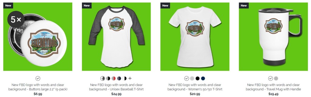 Go to my online shop and scroll through the product pages. Find shirts, sweat shirts, mugs, stickers, backpacks, hats, and more. There is surely something for everyone. Proceeds go to support my biking & hiking adventures, as well as, my website. You can choose fabric, size, color, style, and even quality.