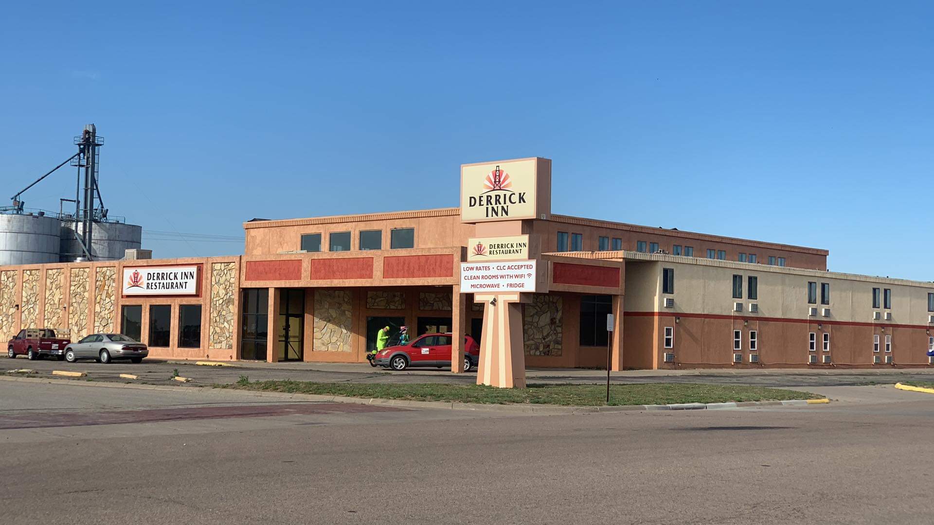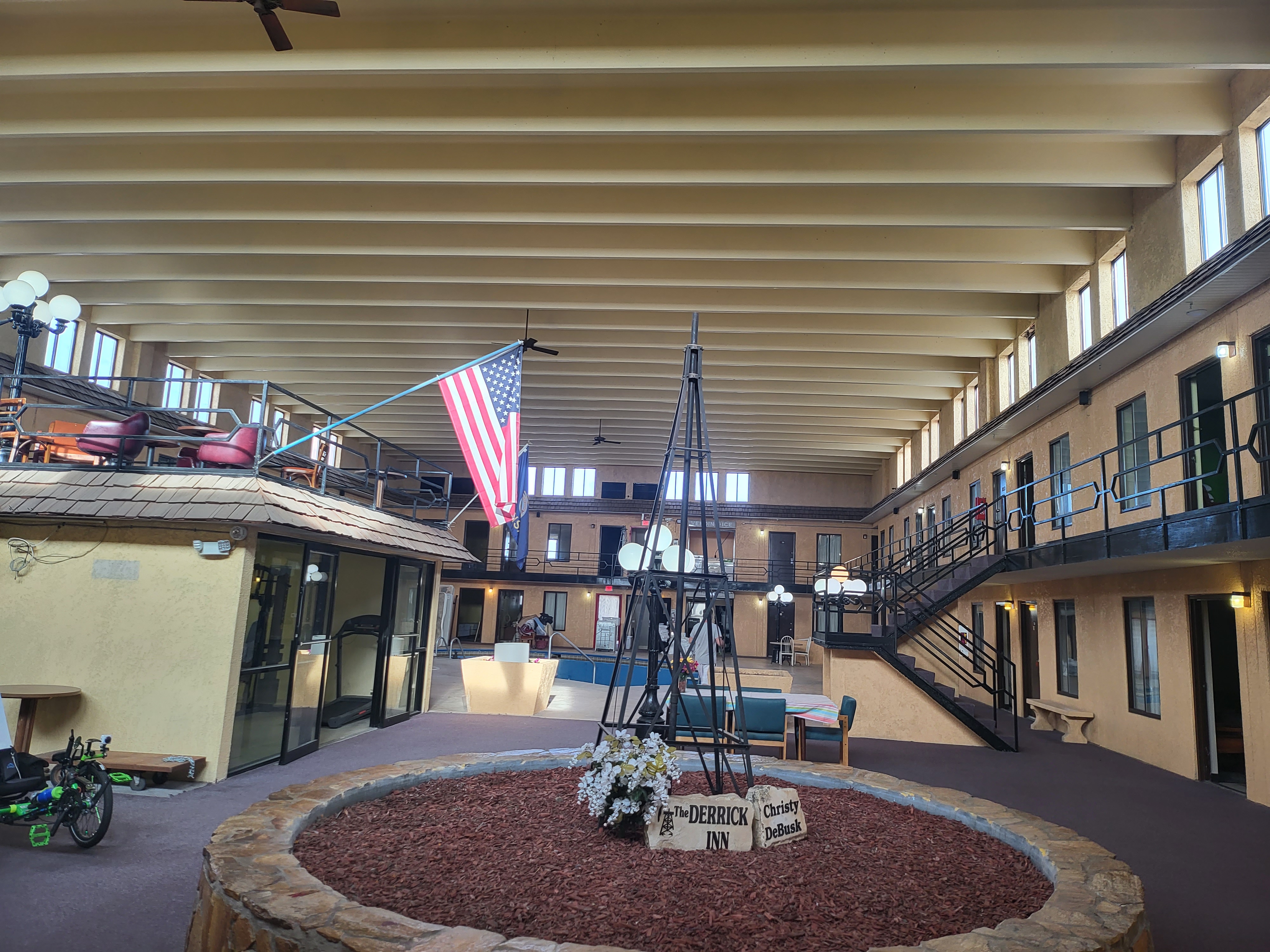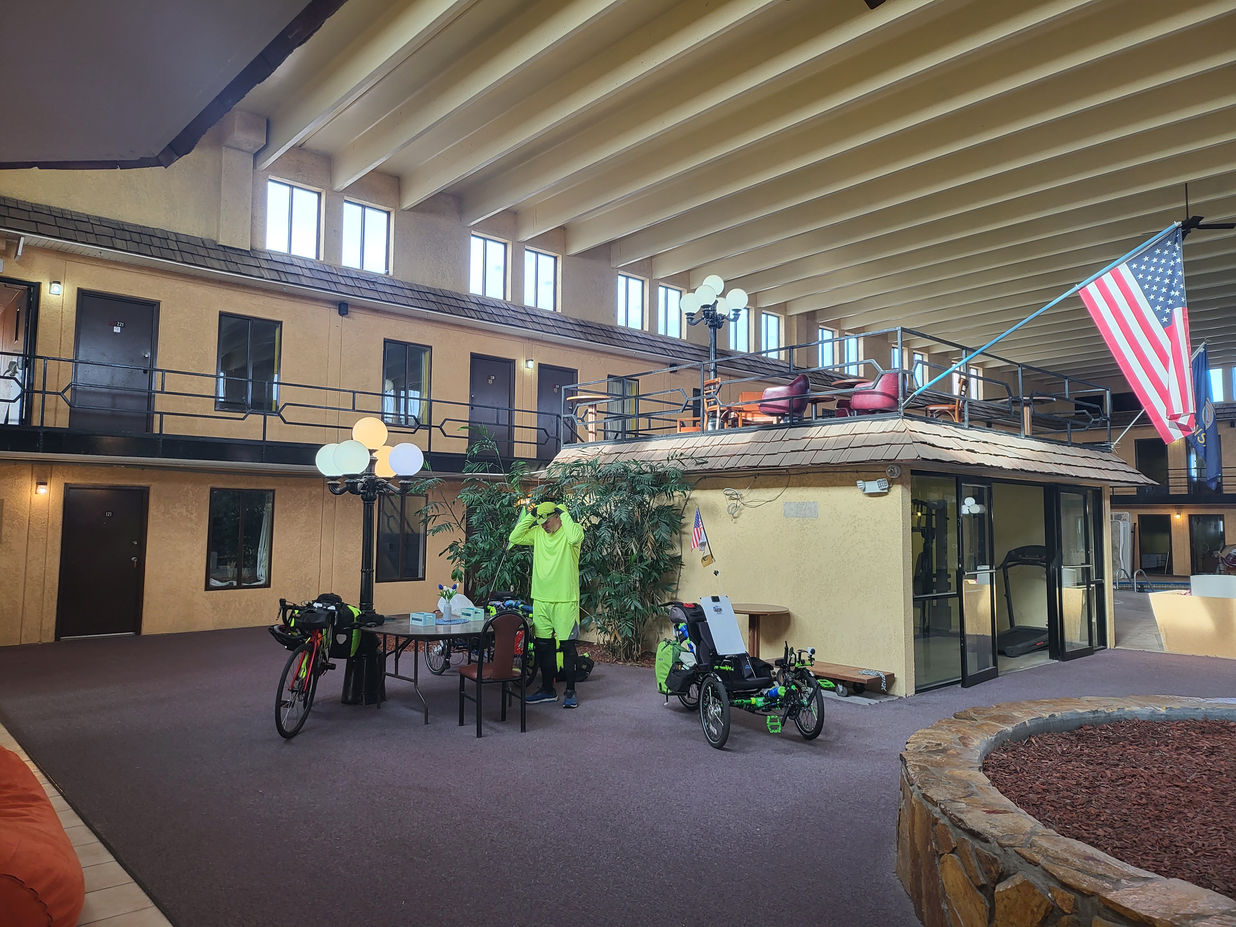 The new owners of the Derrick Inn located in Ness City, KS let us stay in their hotel while still renovating it. The hotel was pretty cool. They had the swimming pool and hot tub in the lobby and all of the rooms surrounded it. They also had live trees growing inside the lobby. Nice wide doors for the trikes, and let us keep them in the lobby. It was very affordable and they are cyclist friendly.
