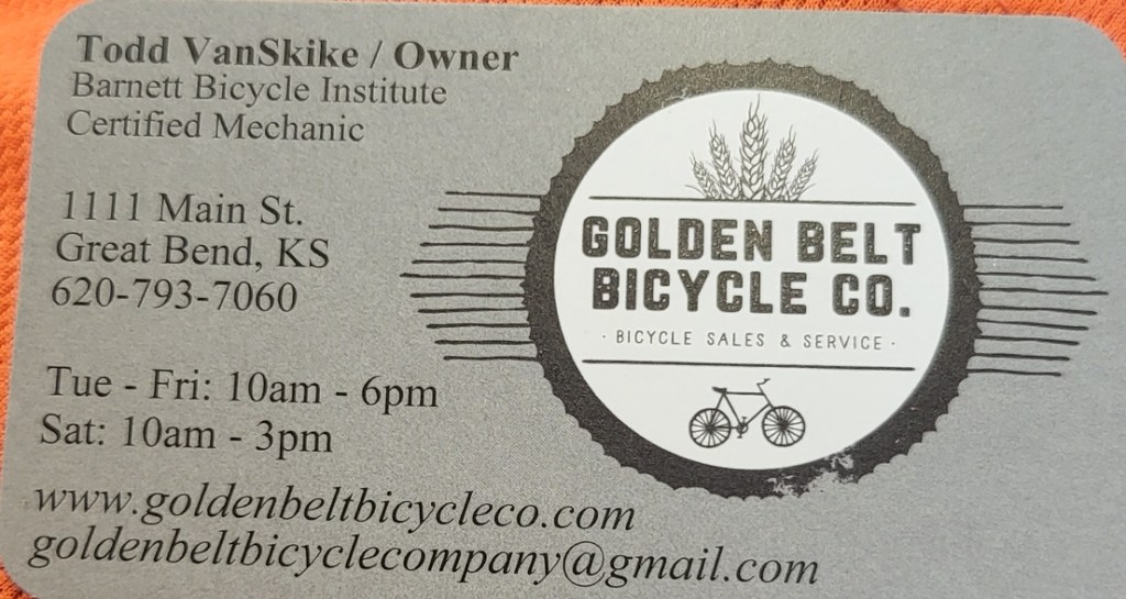 Arrived in Great Bend last night. Decided to take a break day since we FINALLY found a bike shop. Went to Golden Belt Bicycle Company owned by Todd VanSkike on Main Street in Great Bend, Kansas. Despite having other bikes to work on, he jumped on your bikes since we would only be in town for the day.