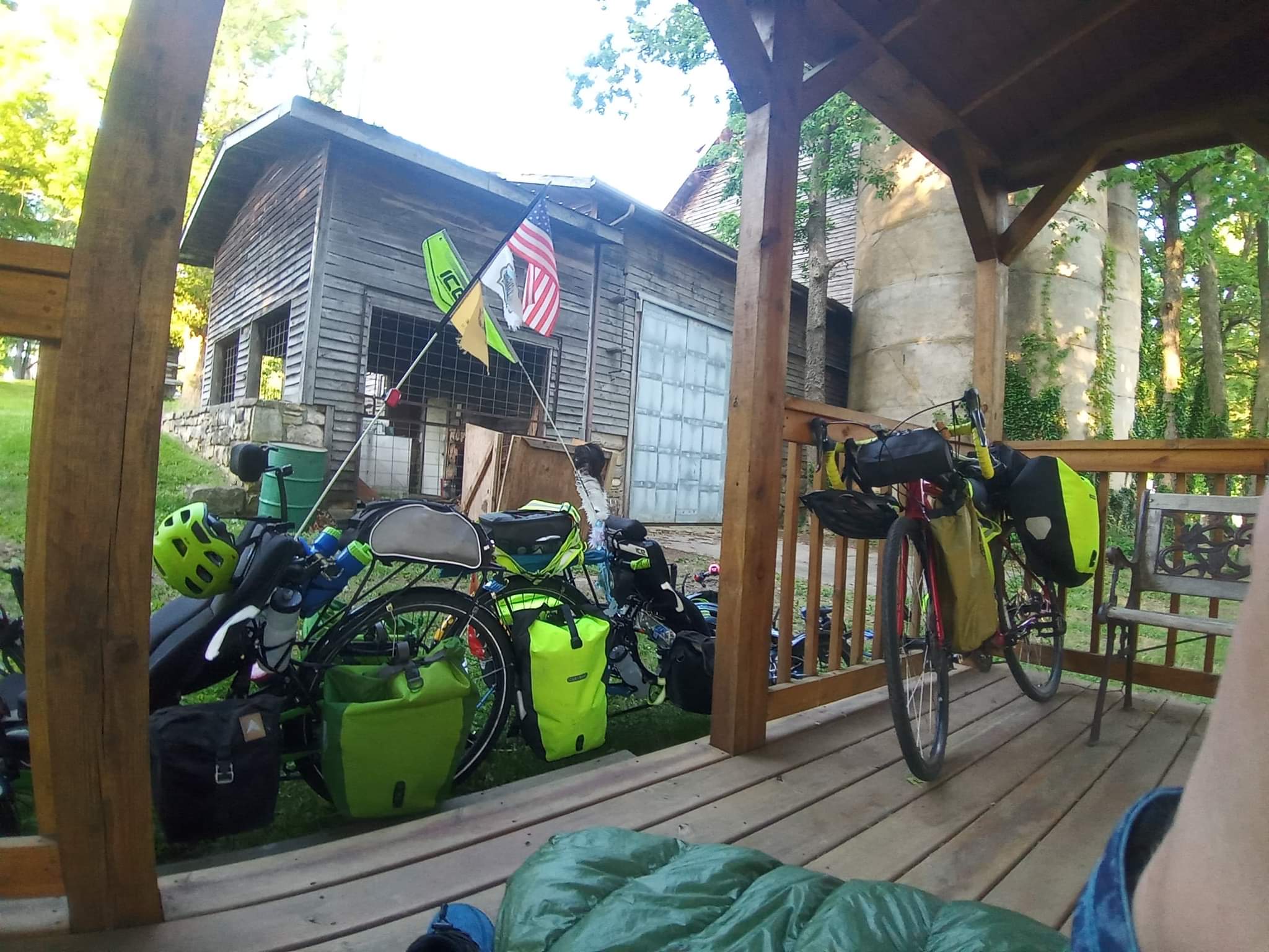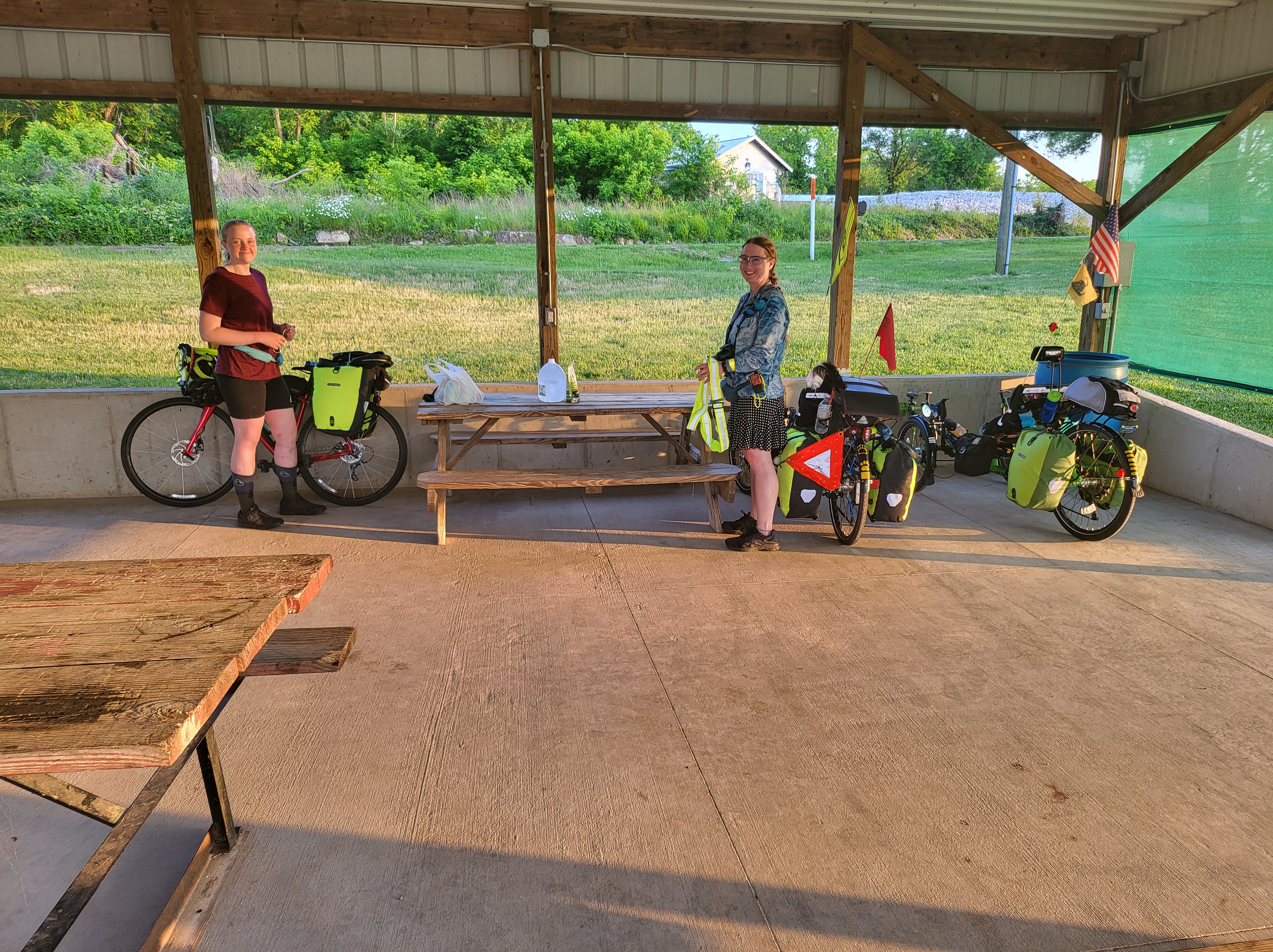 We’ll be staying in Hartville’s city park tonight. They have a great pavilion by a pond, so we’re gonna set up our tents to stay away from bugs.