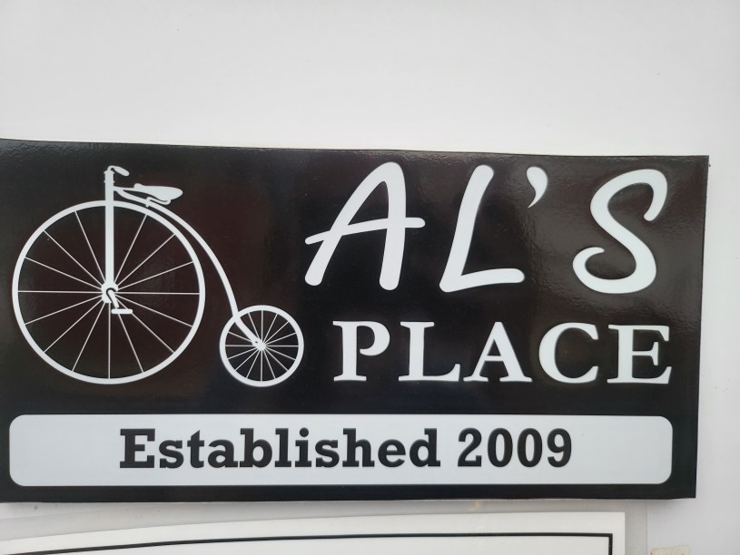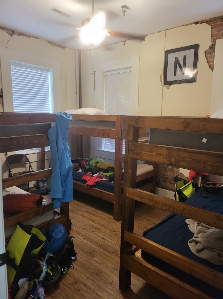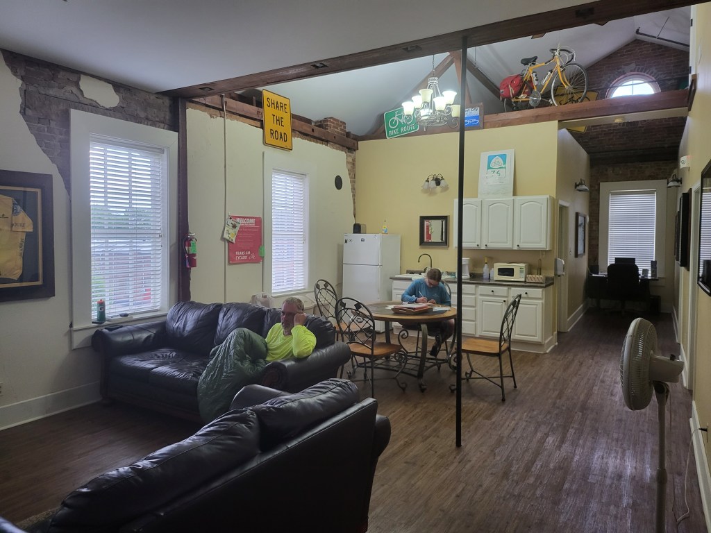 We spent the night, and will be spending the night again in Al’s Place. It’s a GREAT hostel above a Jail Museum, but there is more than enough room for us here! There’s a cage for us to lock up our bikes, TV to watch a movie or two, a table to eat at, a laundry room stocked with bedding and towels, nice bathrooms, and multiple rooms with lots of bunk beds!