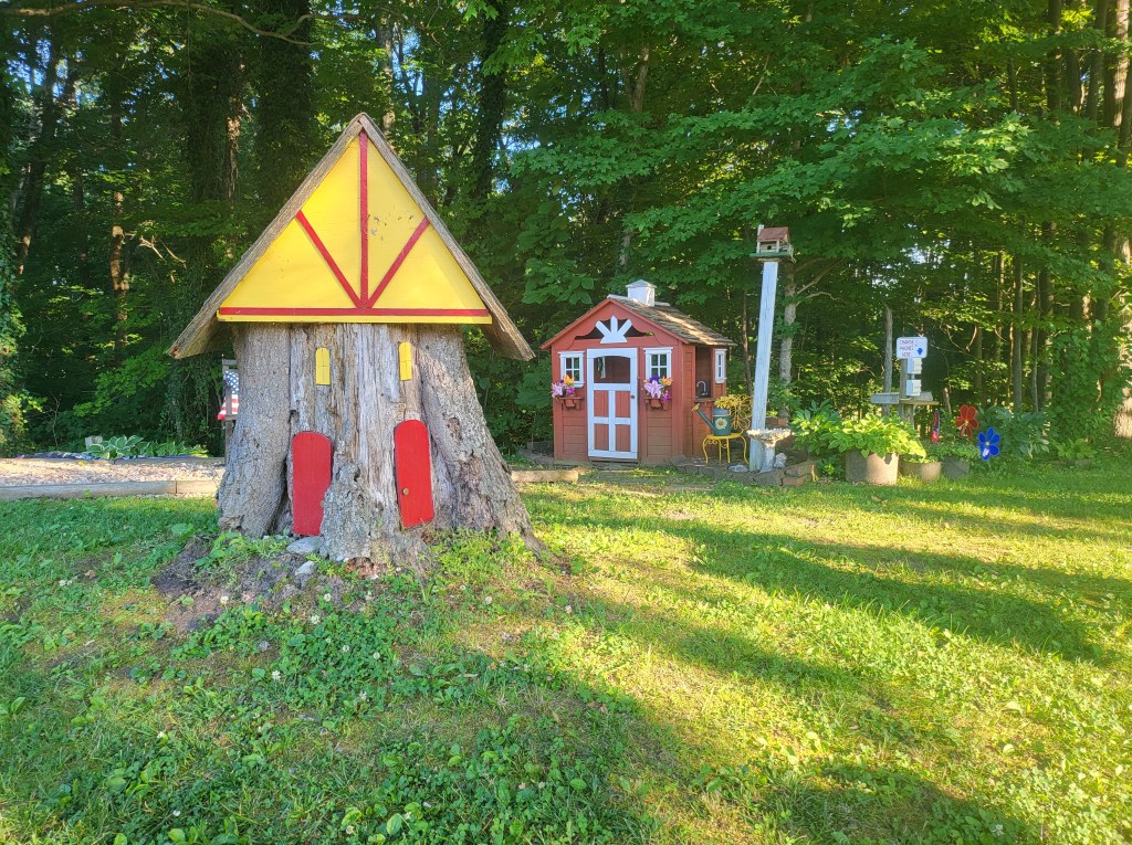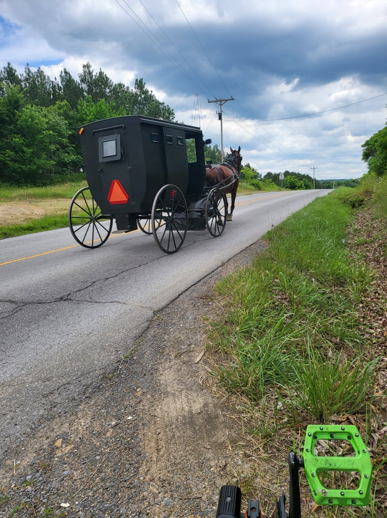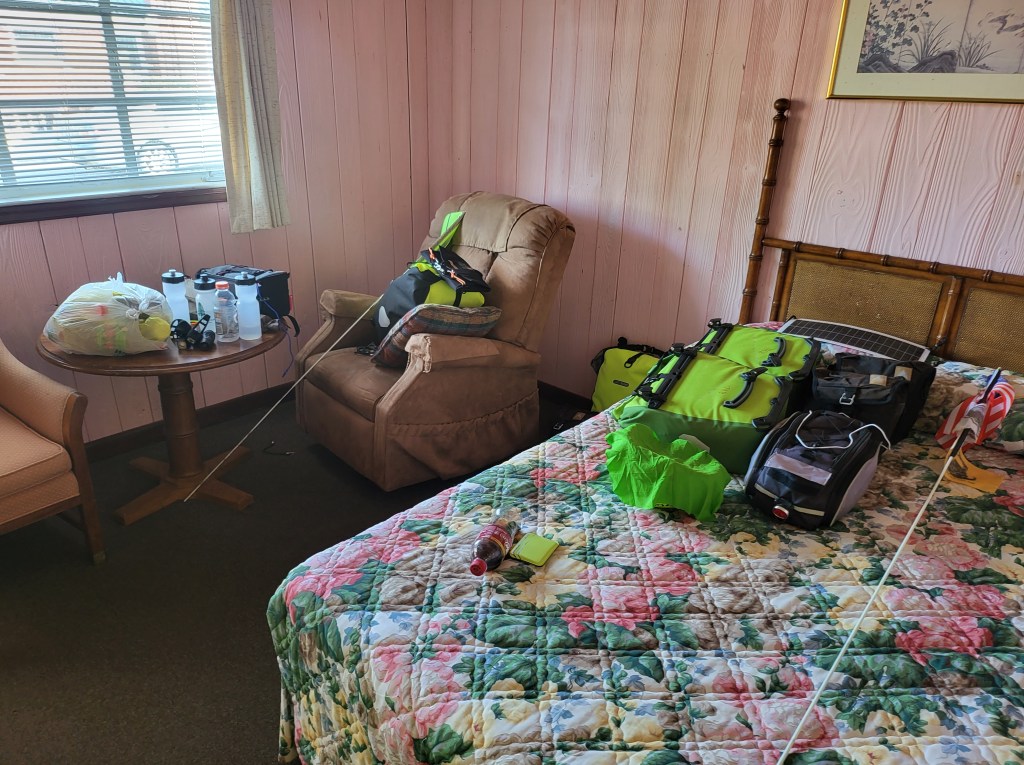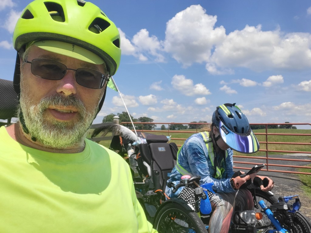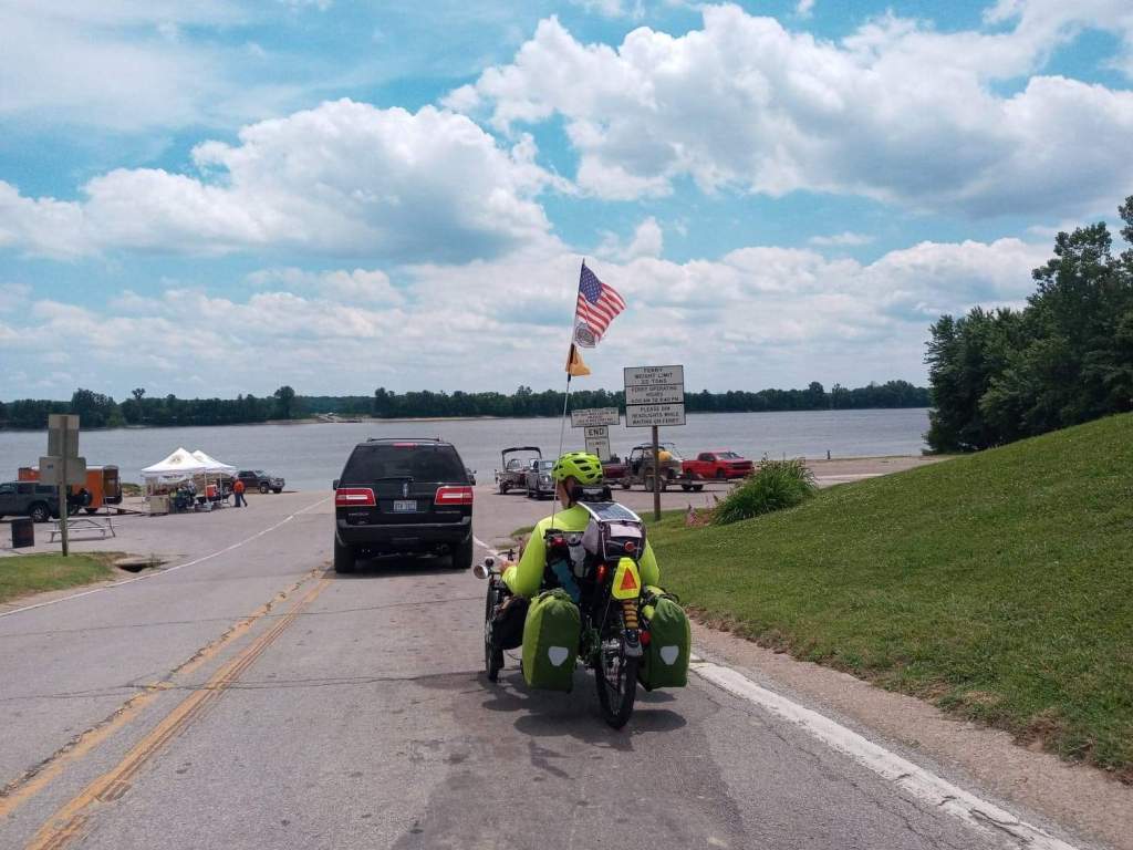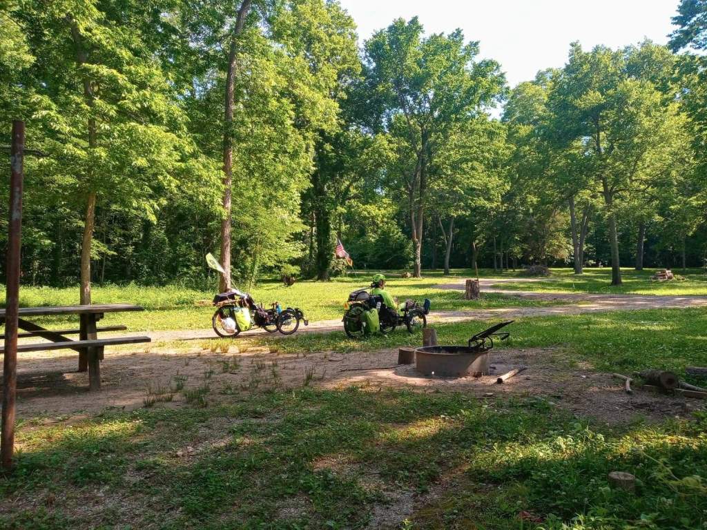Day 27 started in a camp ground in Fern Clyffe park near Goreville, Illinois. We talked with a gentleman the previous evening about bicycling / tricycling, he’s an avid bicyclist who went to the trike side eventually, when trikes were much less common. He then said he’d like to bring us breakfast, which is how we ended up starting the day with bacon, eggs, and toast all fresh and warm. And delicious! He also dries his own fruit for snacks, and so he gave us 2 baggies of yummyness (dried pineapple rings with a cherry in the center, apples, peach bits, walnuts…) and some snack money (thanks again!!). Addie chowed one bag and stashed the other for breakfast. We headed out on a moderate distance day towards Elizabethtown. We saw a bunch of motorcycle/motortricycle-ists and found out there was a cycling event (Hogs on the Rock) near by. Along the route, we saw a cool spot that someone made in their yard to help cyclists who needed a spot to rest for a bit, recharge their phone, or get water. We ended up not being able to contact the only Elizbethtown in-town lodging so we continued 4ish miles out of town to find Tower Rock campground. That was hard because the small roads didn’t have street signs in a lot of places, and we added a mile or more (oops) over some big hills (groan) but did eventually make it to camp along the Ohio River.