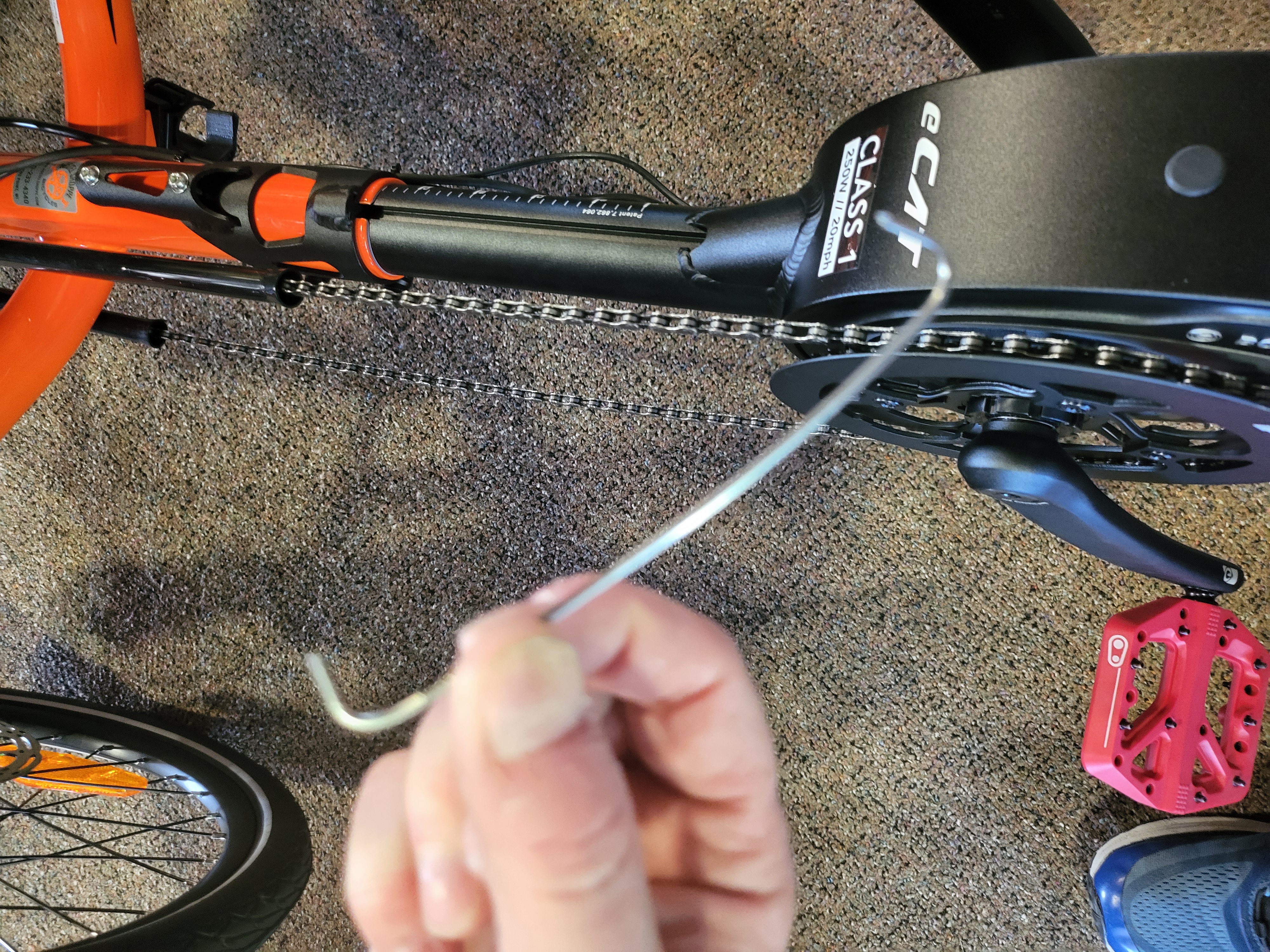 I watched the shop while they were adjusting my chain length. They showed me a new ‘tool’ that helps, a bent spoke.