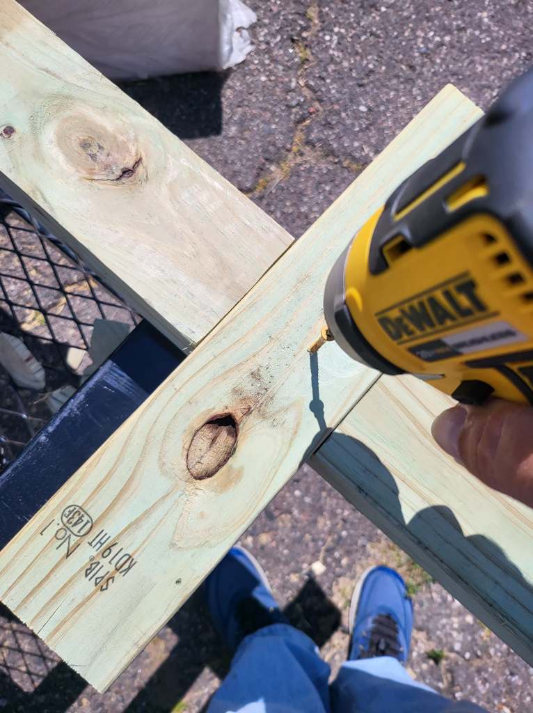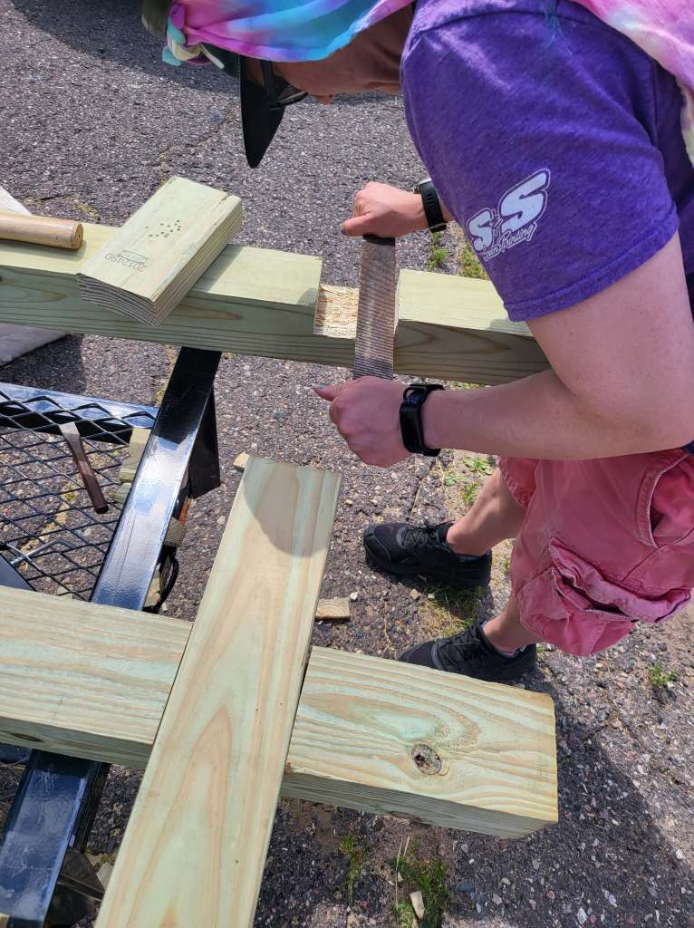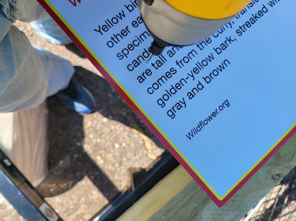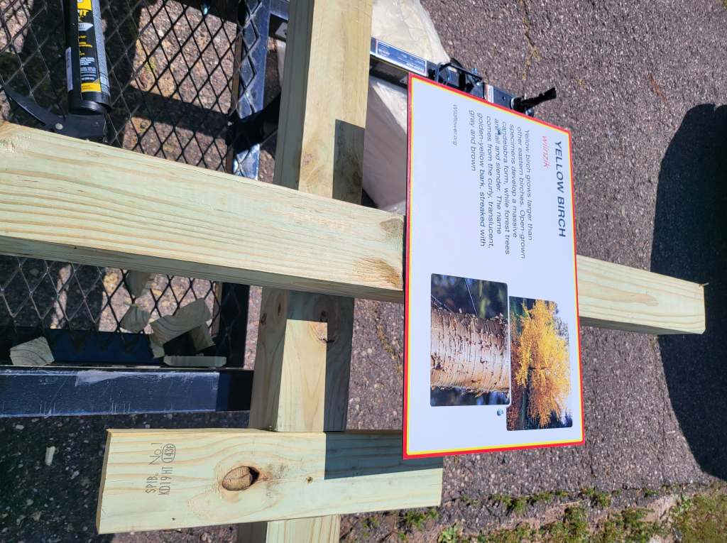 For the nature signs, we built 22 signposts. We cut and notched the 4×4 post and inserted 2×4 support beams for the nature signs. Glued the notches together with liquid nail and a couple of screws. Should last a long time, so long as no one destroys them.