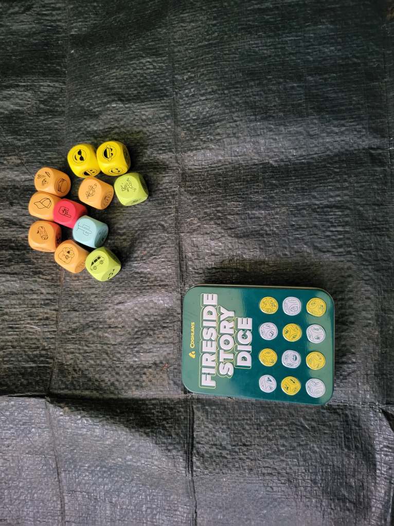 We played with my fireside story dice each night. It is 12, 6-sided dice each side with a different picture on it. You shake them up and roll them out. Taking turns, you choose a die and make a few sentences about it to create a short story. We had a lot of fun making up adventures for poor Artuin the turtle.