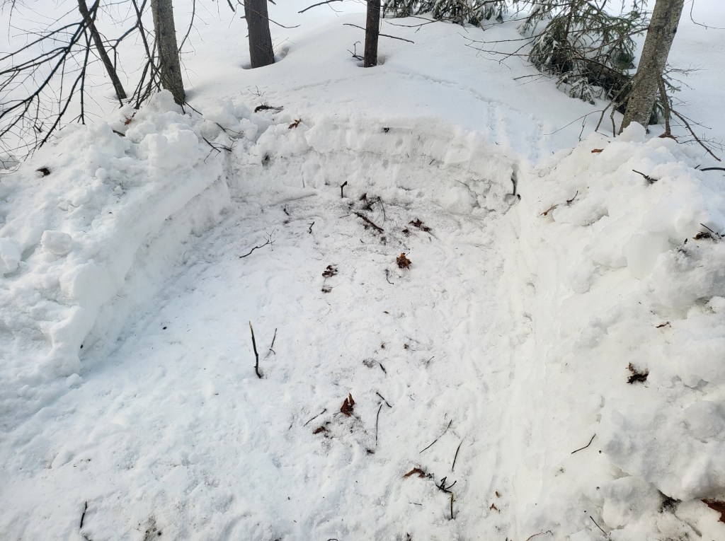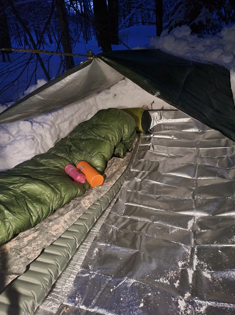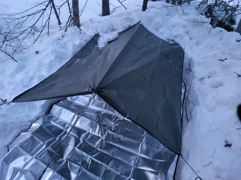 A few days ago I went camping in a snow storm. Hiked out into some woods near my home and built a snow shelter for the night. I used two reflective tarps, one for the roof and one for the ground. I dug out a hole in the snow with enough room to set my air mat, bivi sack, and down quit. No fire was made. Temp got as low as 11*F when I checked it at 3am when I got up to water a tree šŸ˜‰ . I was perfectly warm and comfy the whole night. I wore my down pants and puffy jacket which are good for me down to 0*F. It snow most of the night and I woke up in the morning with about 4 inches of fresh snow. My tracks coming were nearly gone. I had a lot of fun and hoping to go back out there soon.