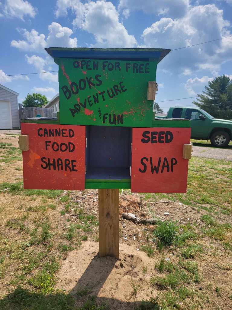 I also built a mini library kiosk which has 3 sections, 1st books, 2nd can food exchange, 3rd seed exchange. There is a nice bench I built onto it as well. I have built around a dozen mini libraries and set them up all over the neighborhood. Just behind the sign and mini library is a community garden friends of mine built. And if that isn’t enough, some other friends built a Frisbee golf course throughout the remaining field. The Township pitched in as well and donated multiple basketball hoops placed in a side lot along with several balls. A little something for everyone almost.