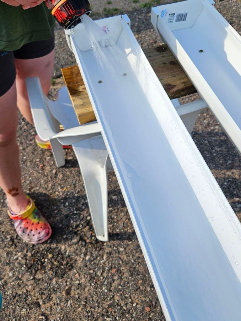 Next I got some 1×6 and cut three 15in boards for each set. After screwing the gutters to the boards, Addie applied some silicone to the screw heads to stop any leaking.