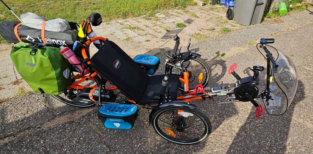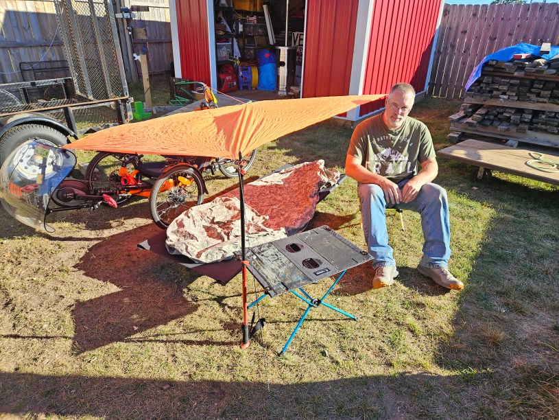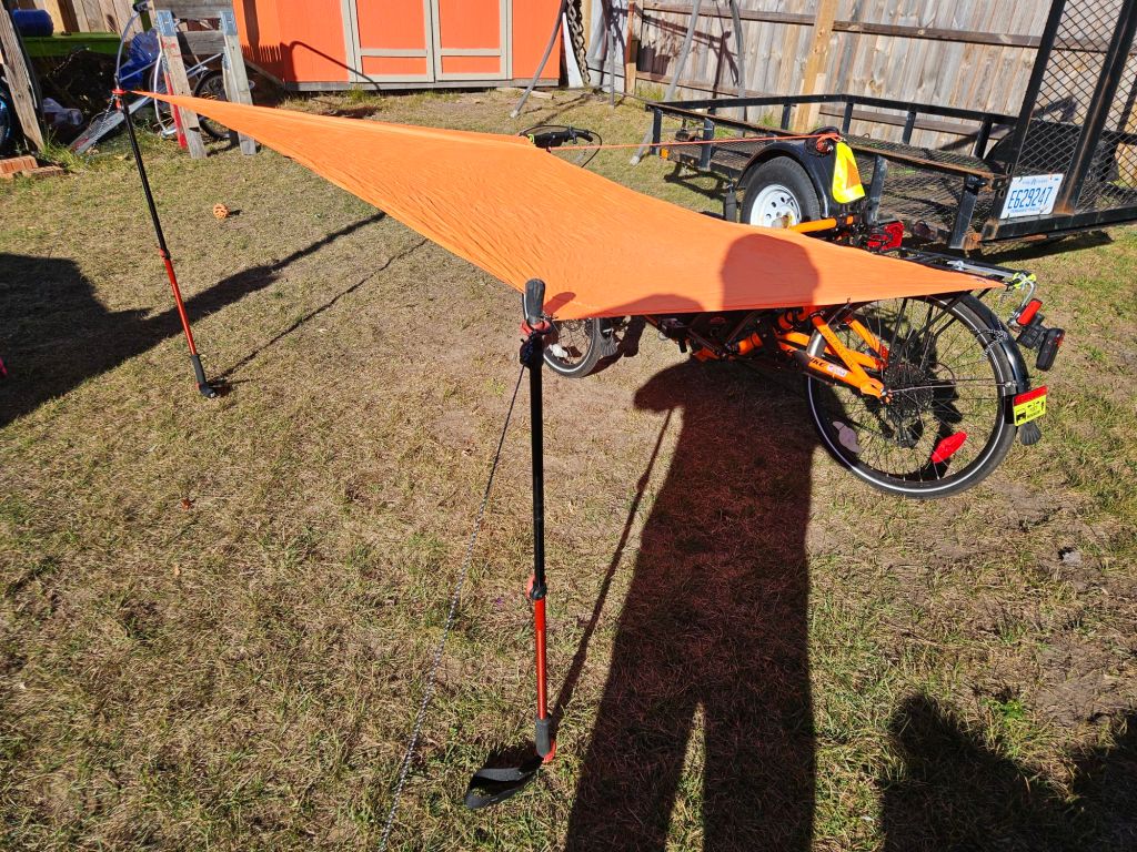 I use an orange hi-viz tarp the same length as trike give or take an inch or two. Two rubber twist ties. One at each corner to attach tarp to trike easily. Two poles, currently adjustable trekking poles. And two stakes.