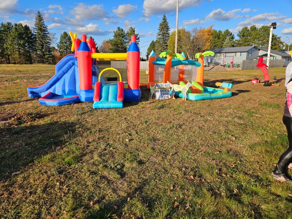 At the top of the hill, where you get on/off the hayride, we have bounce houses, games, and a live DJ.